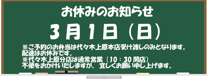 - 【2月1日より】「午後特価(お肉)弁当」は改め、「特価弁当(さかな)」と「特価弁当(肉)」が終日ご注文可能になります。